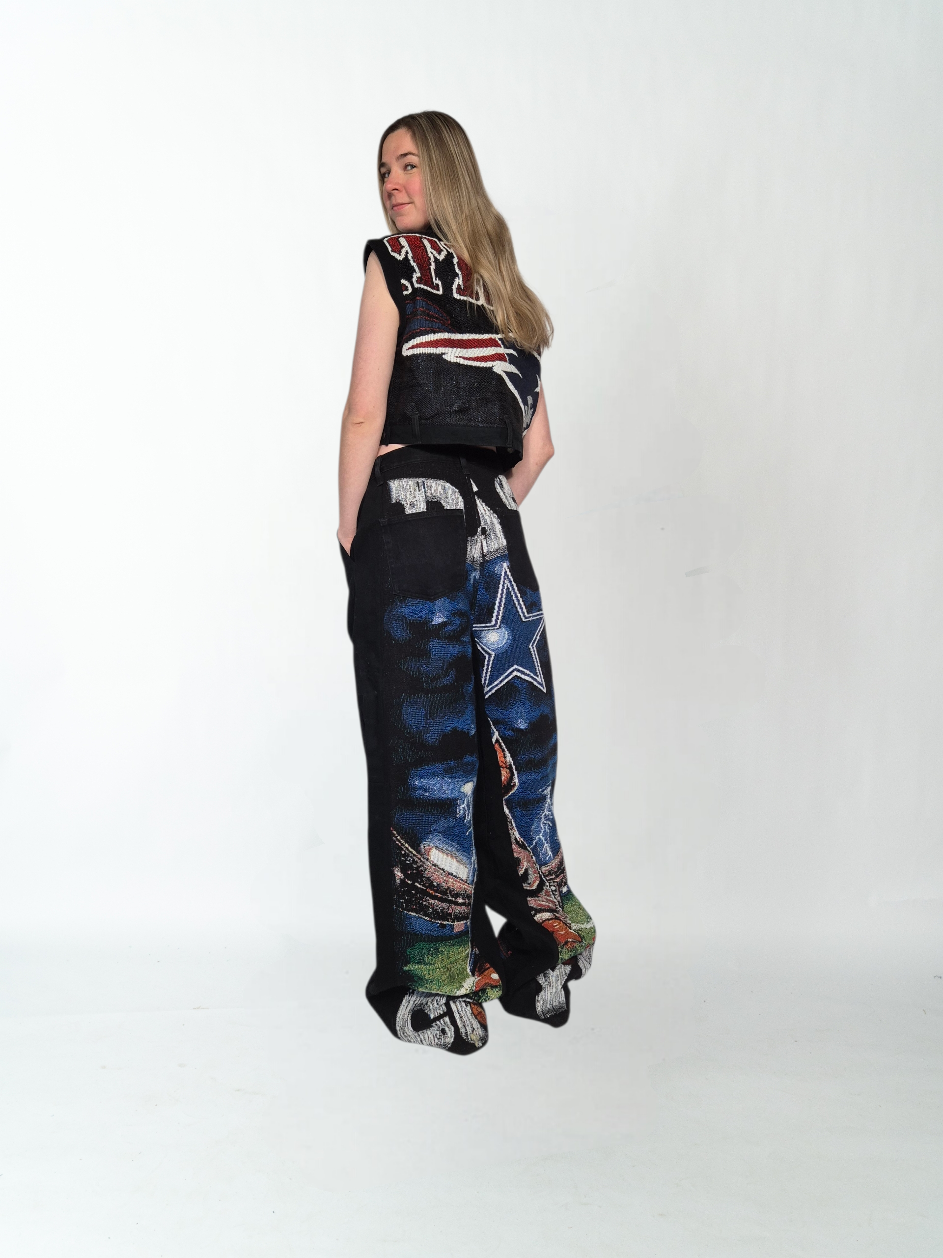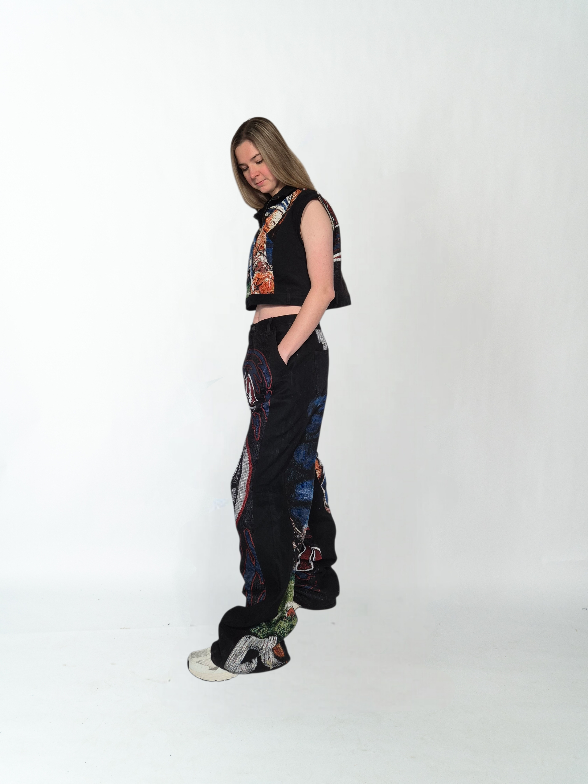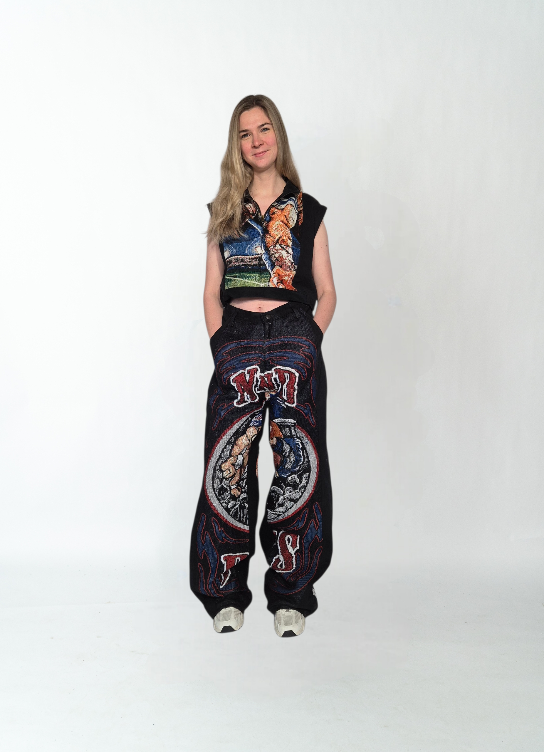 These matching jeans are crafted from upcycled tapestry and rescued vintage denim, making every pair truly one of one. Designed with a unisex fit, they’re made to suit every body while keeping the signature noacustom statement look.
