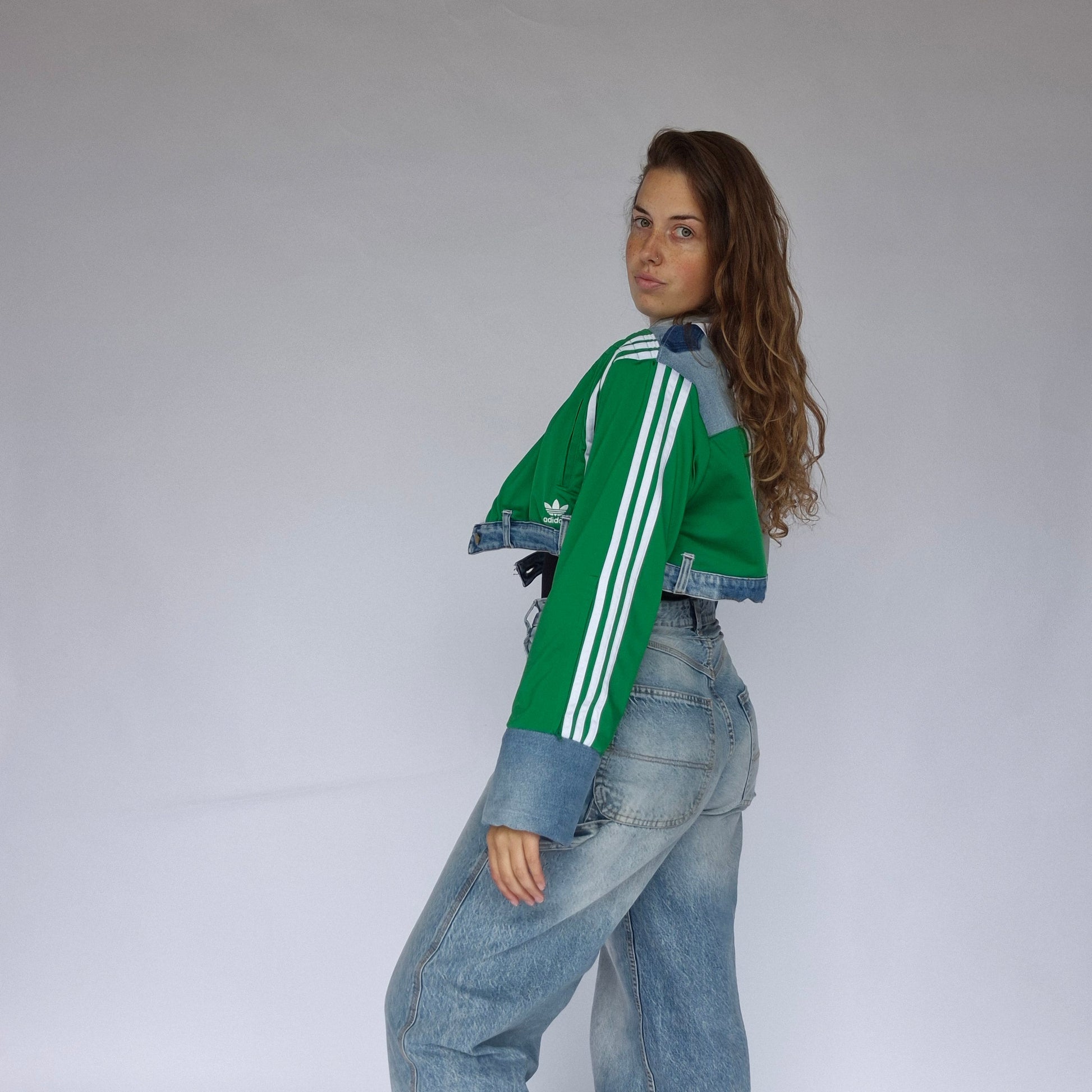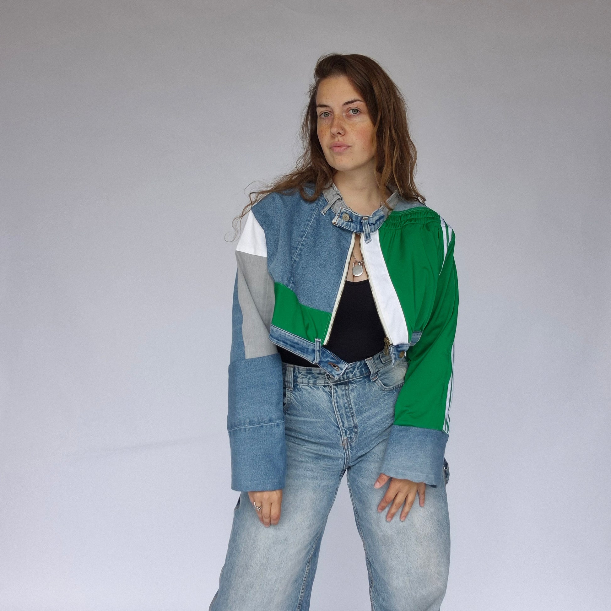 This oversized jacket blends clean lines with bold design for a stylish yet relaxed look. Crafted from upcycled materials, each piece is one-of-a-kind and highlights sustainable craftsmanship.