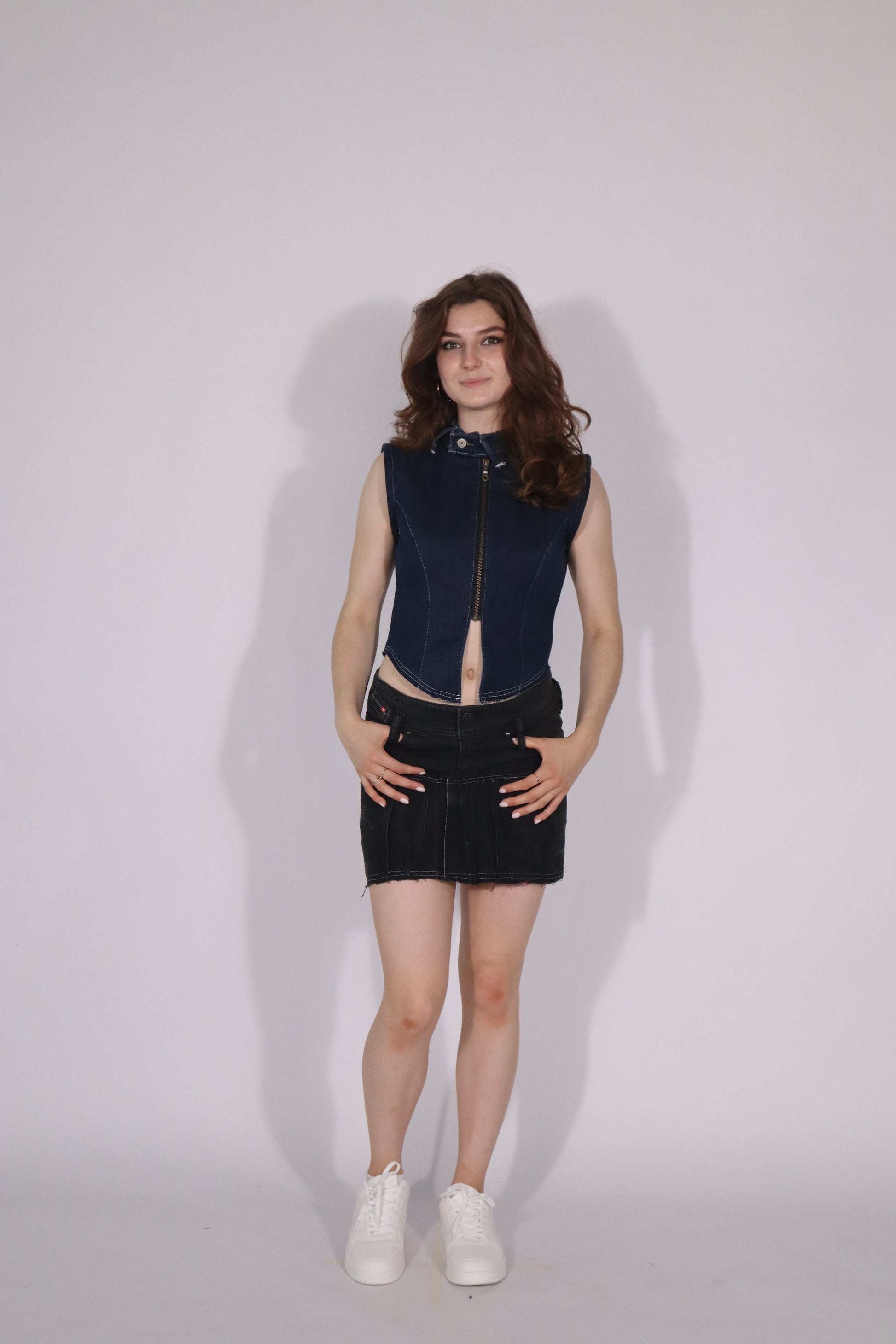 This unique denim skirt is handcrafted from upcycled jeans, featuring a patchwork waistband and a darker denim hem for a bold contrast. The raw-cut bottom edge adds an edgy finish.