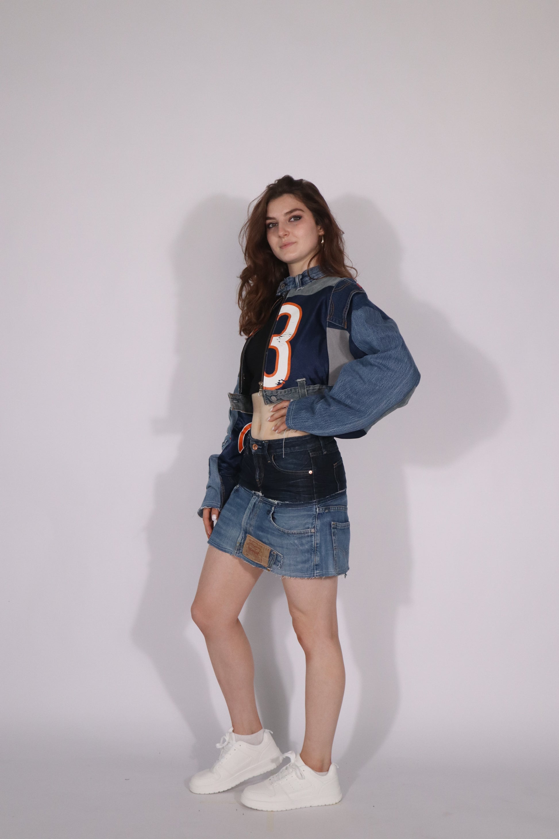 This unique denim skirt is handcrafted from upcycled jeans, featuring a patchwork waistband and a darker denim hem for a bold contrast. The raw-cut bottom edge adds an edgy finish.