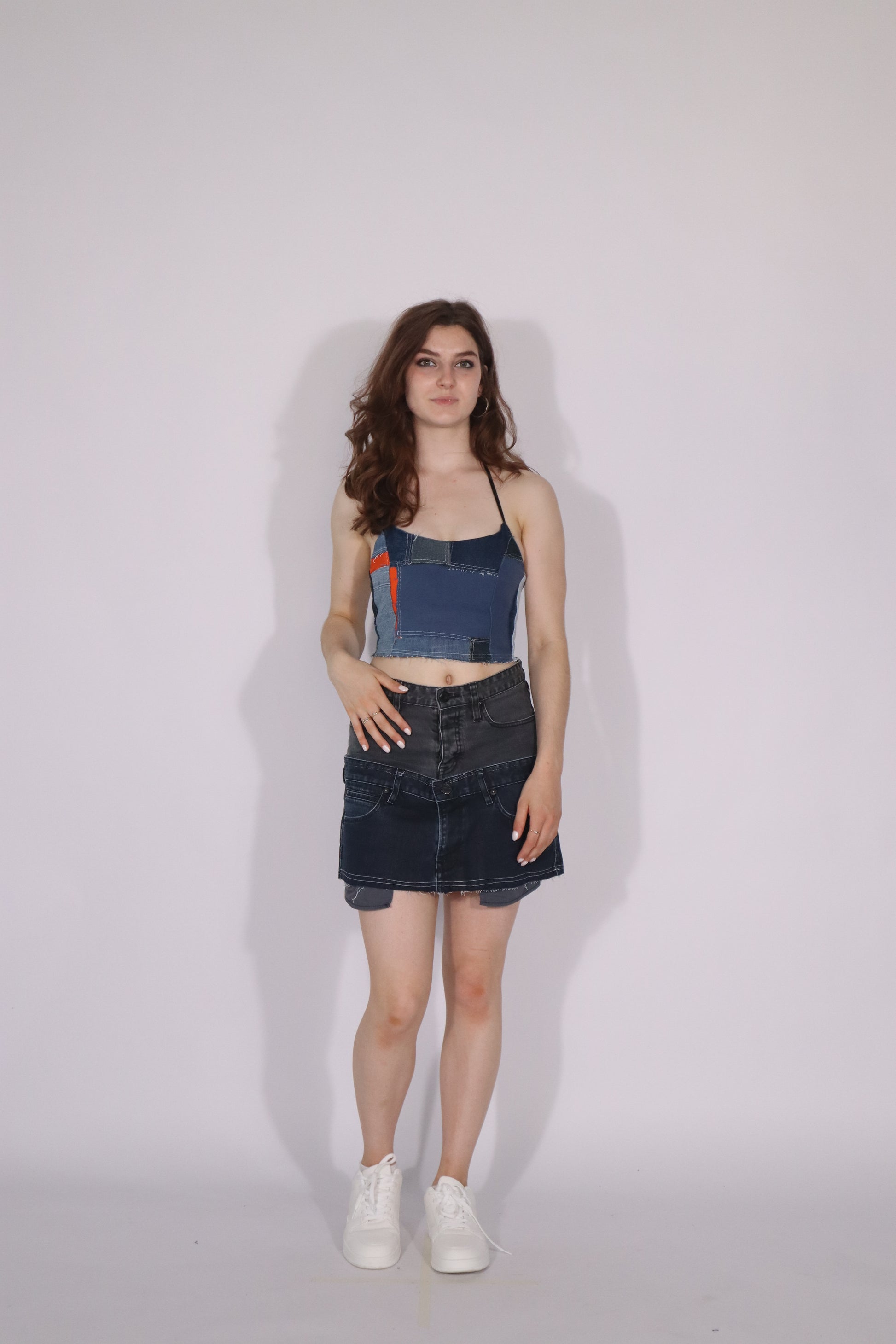 This unique denim skirt is handcrafted from upcycled jeans, featuring a patchwork waistband and a darker denim hem for a bold contrast. The raw-cut bottom edge adds an edgy finish.