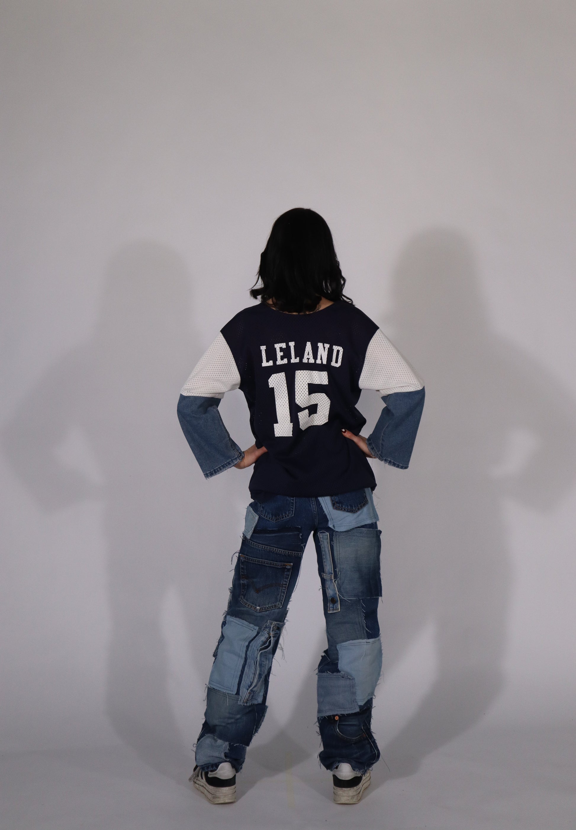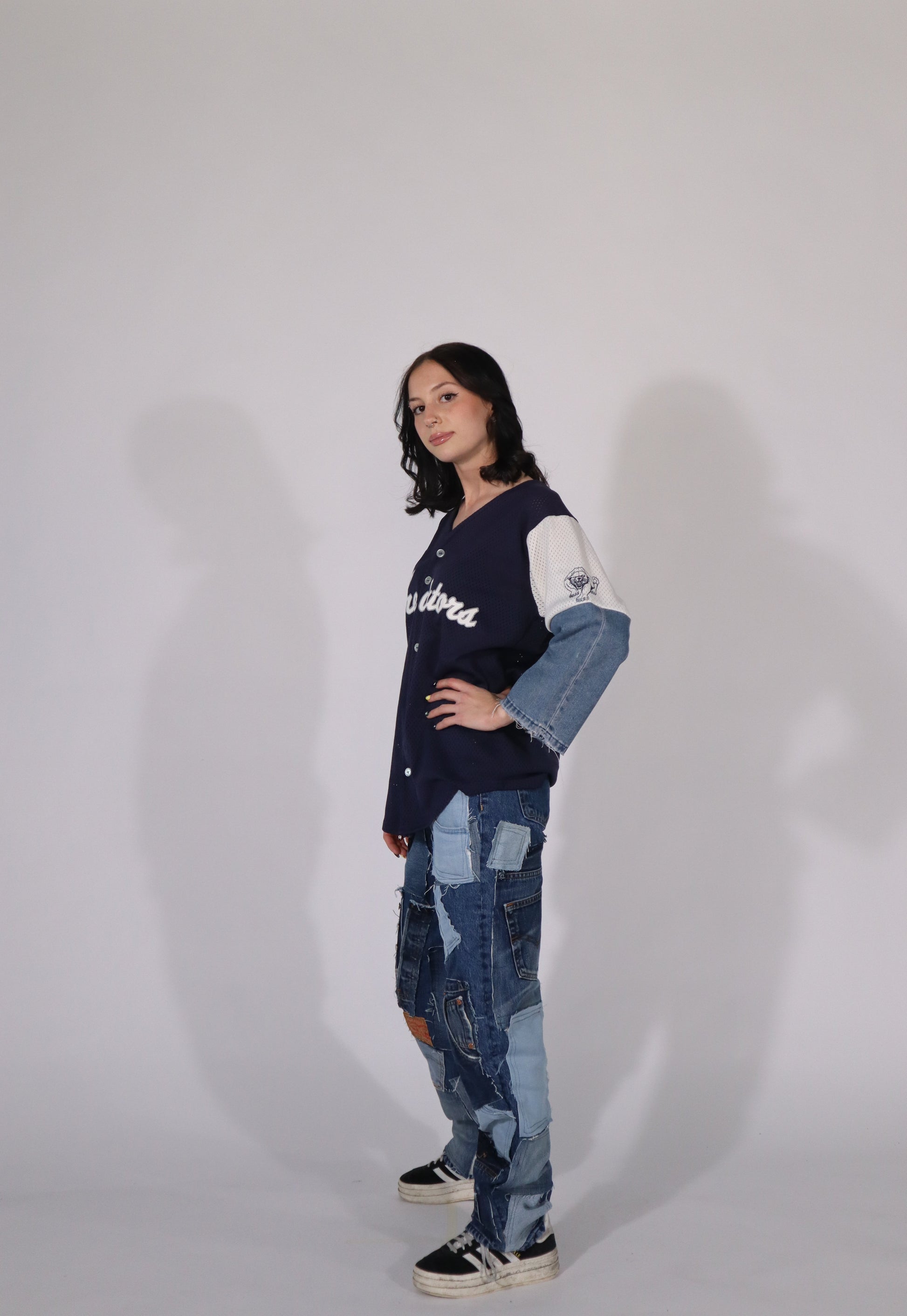 Turn heads at your next festival with this one-of-a-kind upcycled jersey. Handcrafted from vintage sportswear, it features bold denim sleeves that add an edgy twist to the classic jersey design. The fusion of soft, breathable fabric with rugged denim creates a standout piece that's both comfortable and stylish.