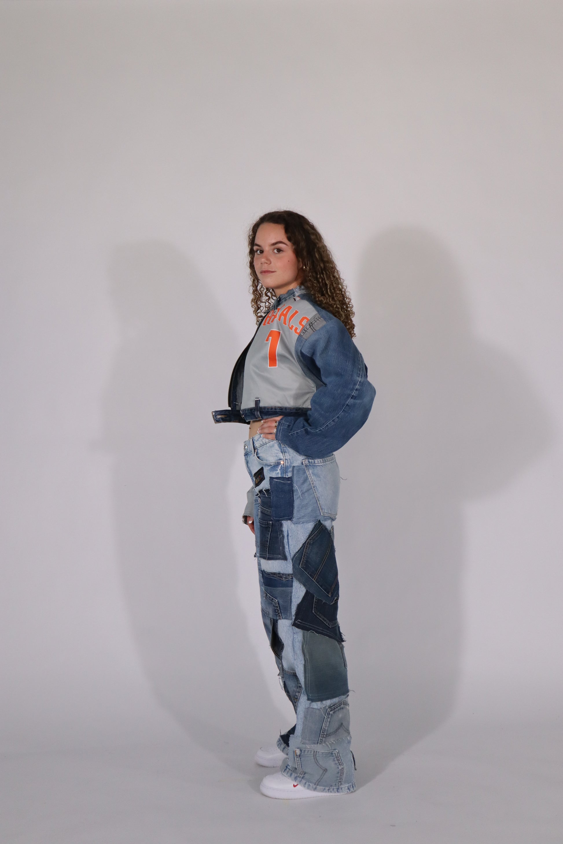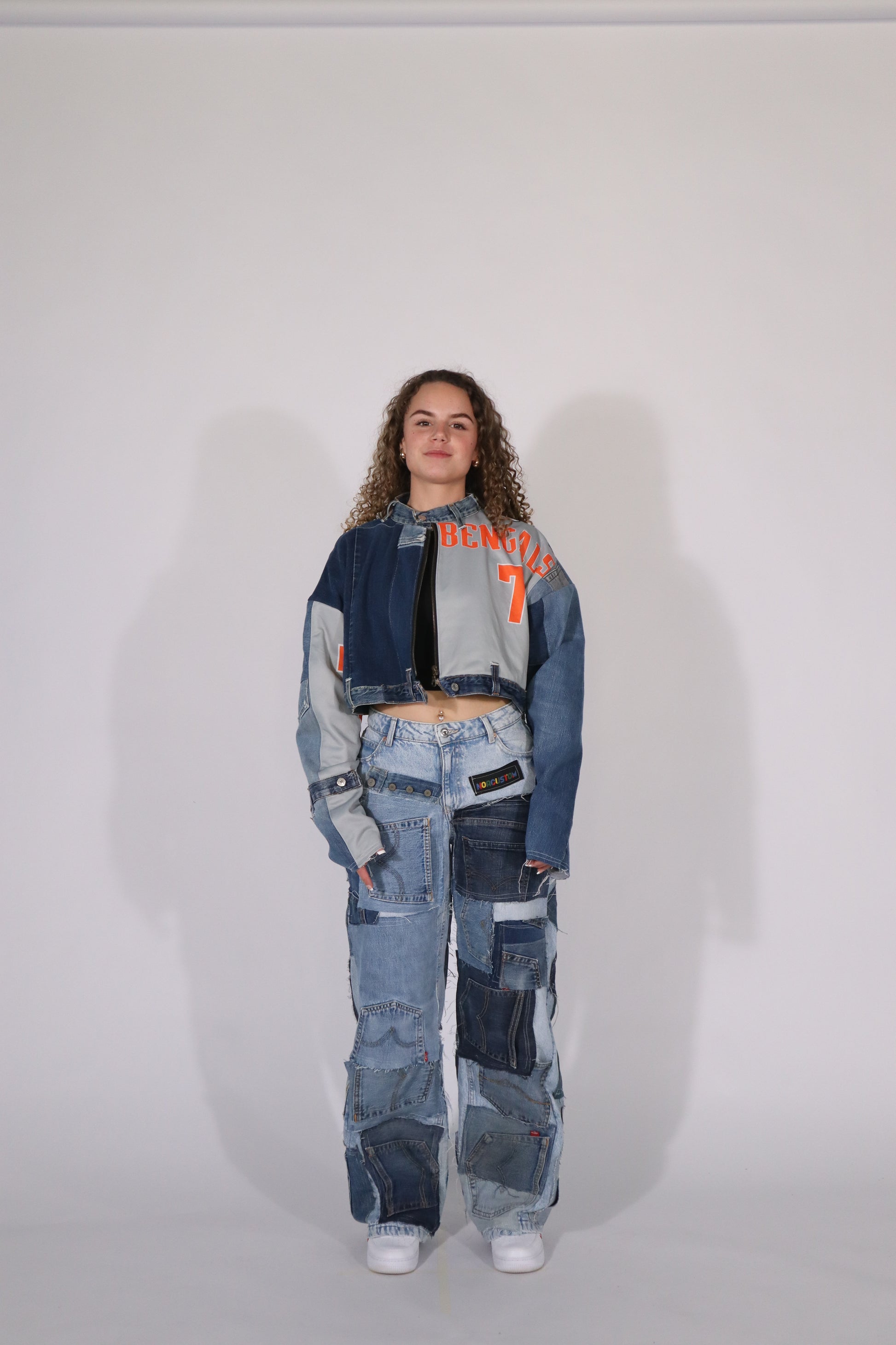 Turn heads with this one of a kind cropped upcycled NFL jacket. Handcrafted from authentic vintage materials, each piece is completely unique reworked for a bold, modern fit with a raw edge finish. The jacket features original NFL graphics and team details, giving classic sportswear a fresh, fashion-forward twist.
