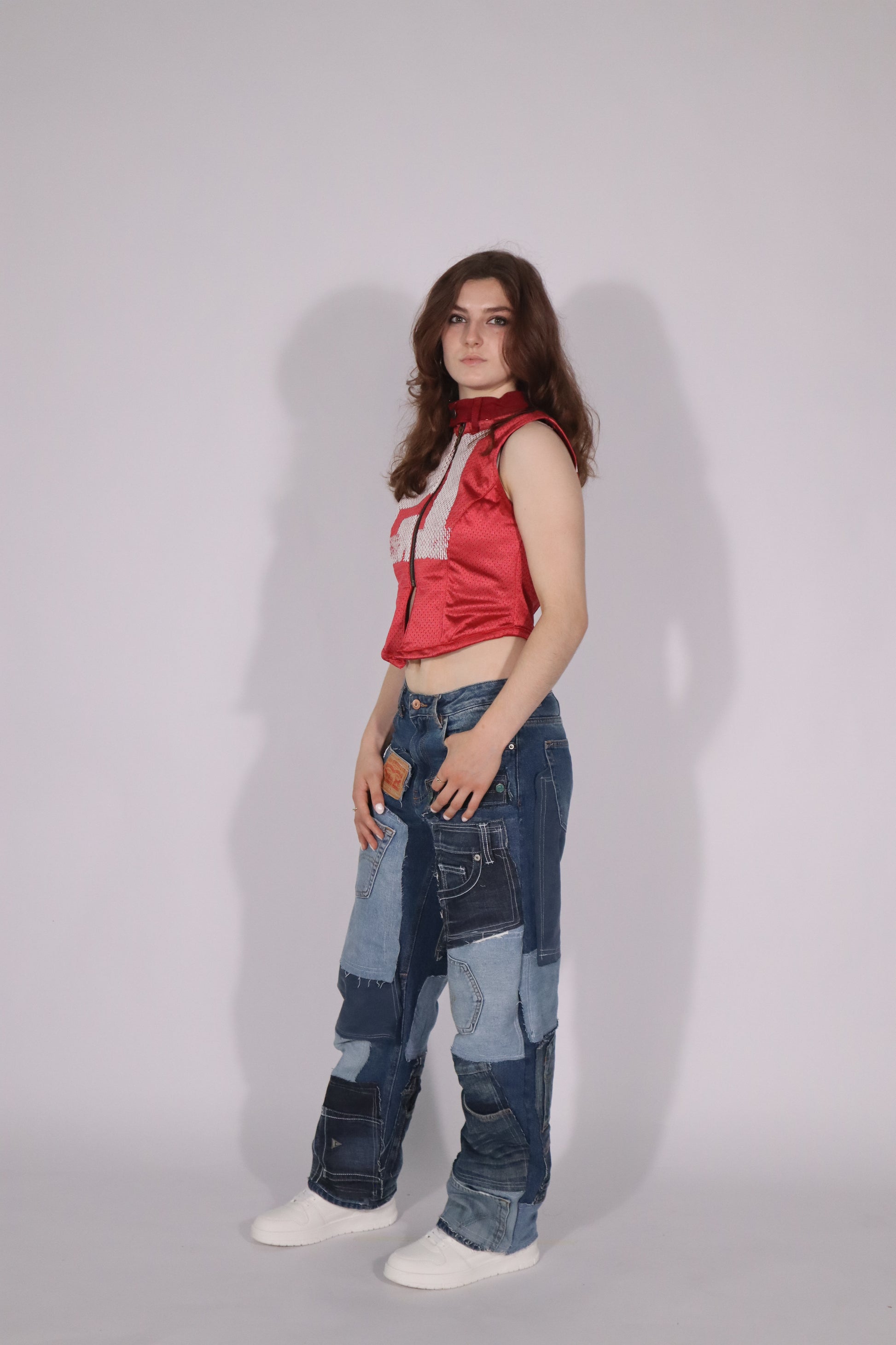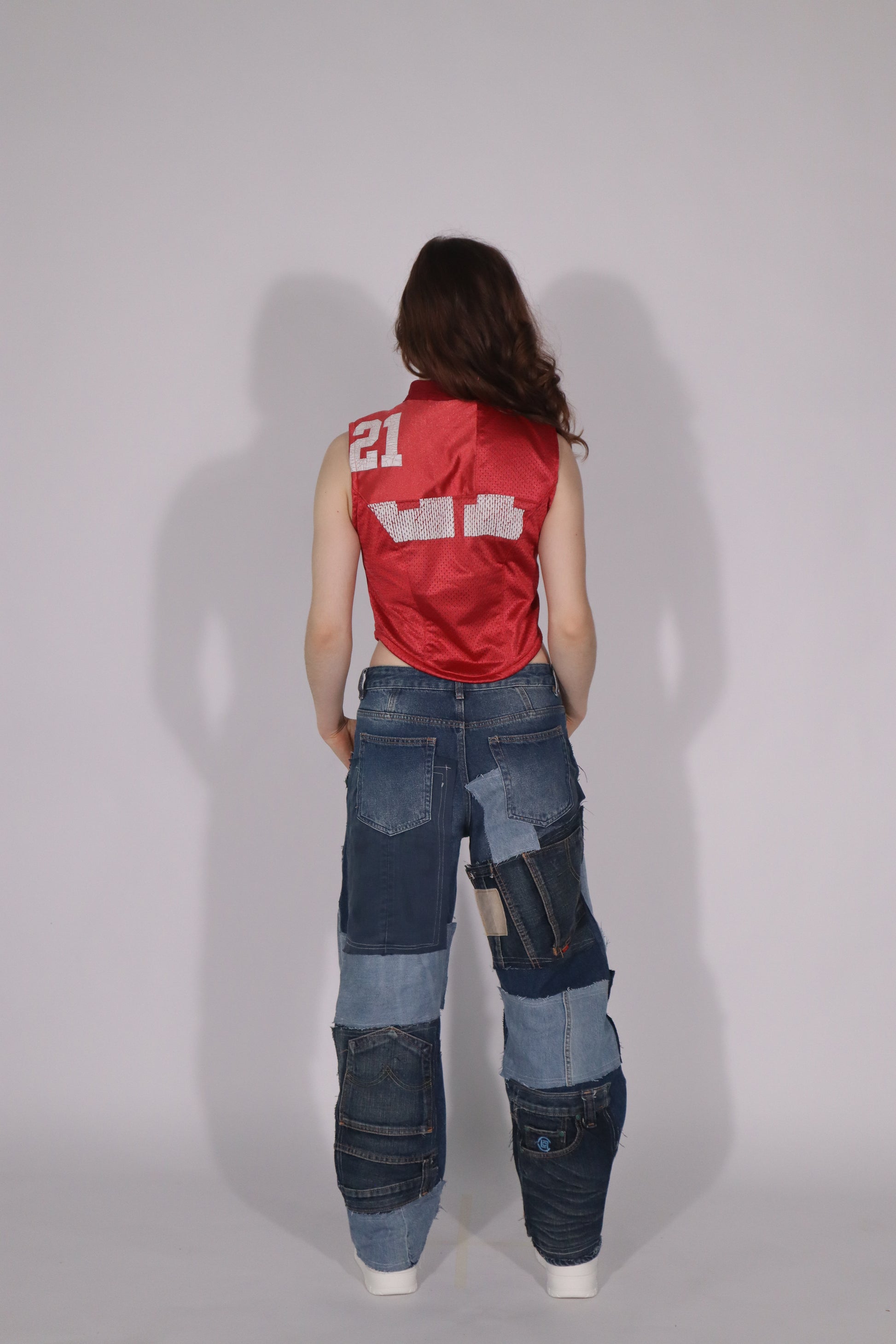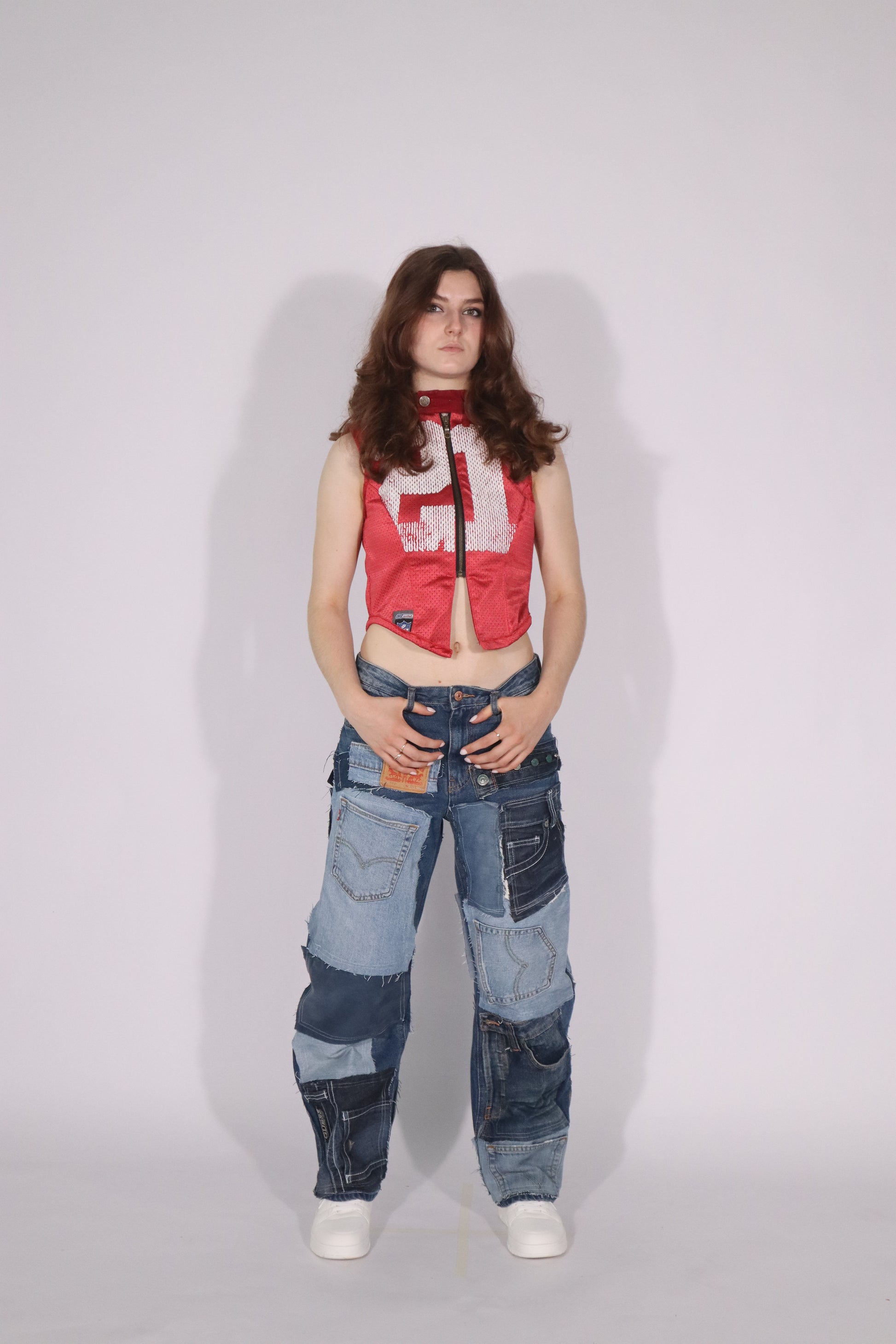 This one-of-a-kind race vest is handmade from upcycled materials, giving each piece a unique character. Featuring a bold sports-inspired details, finished with a sturdy front zipper and raw-cut armholes for an edgy look.