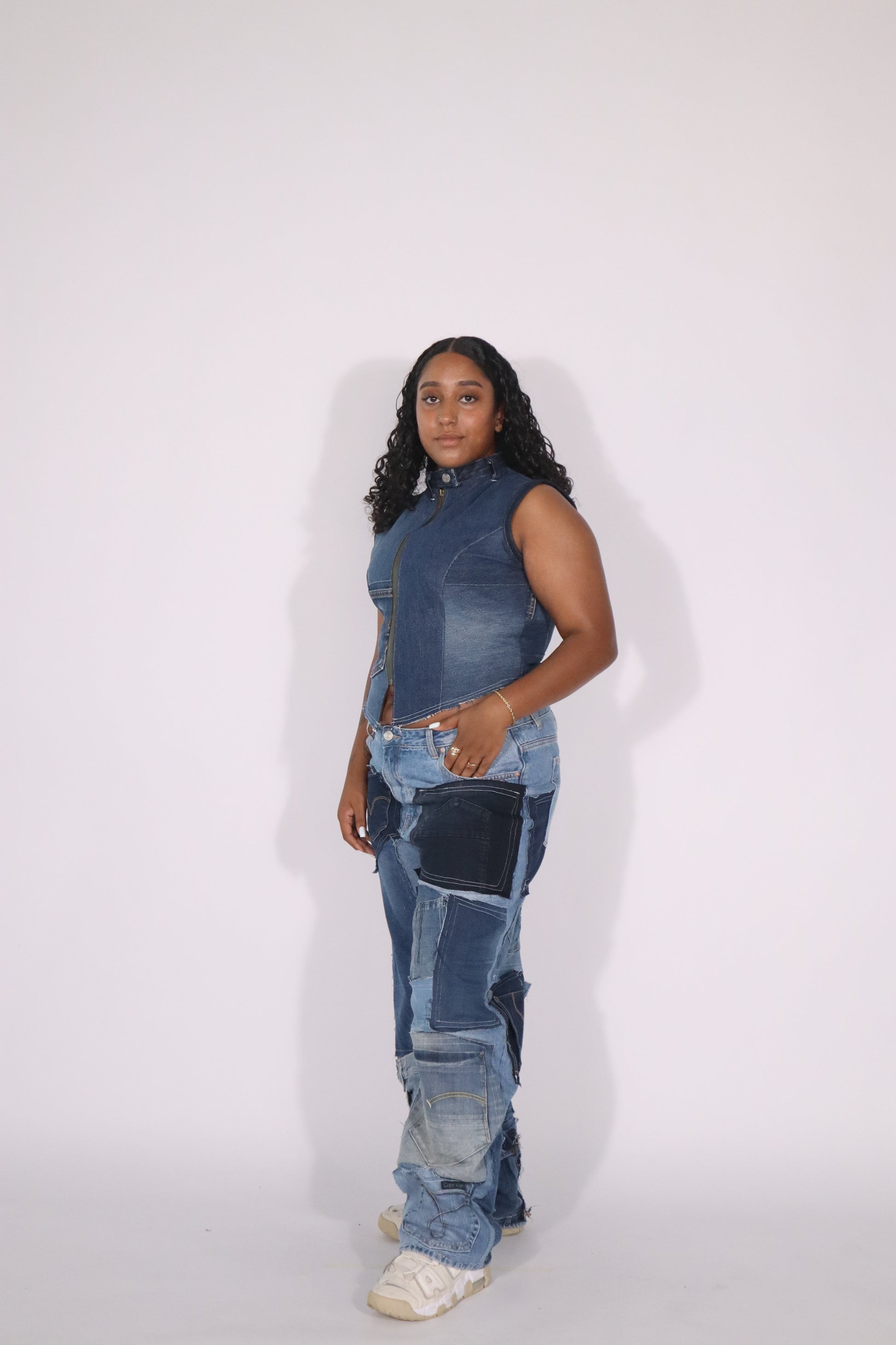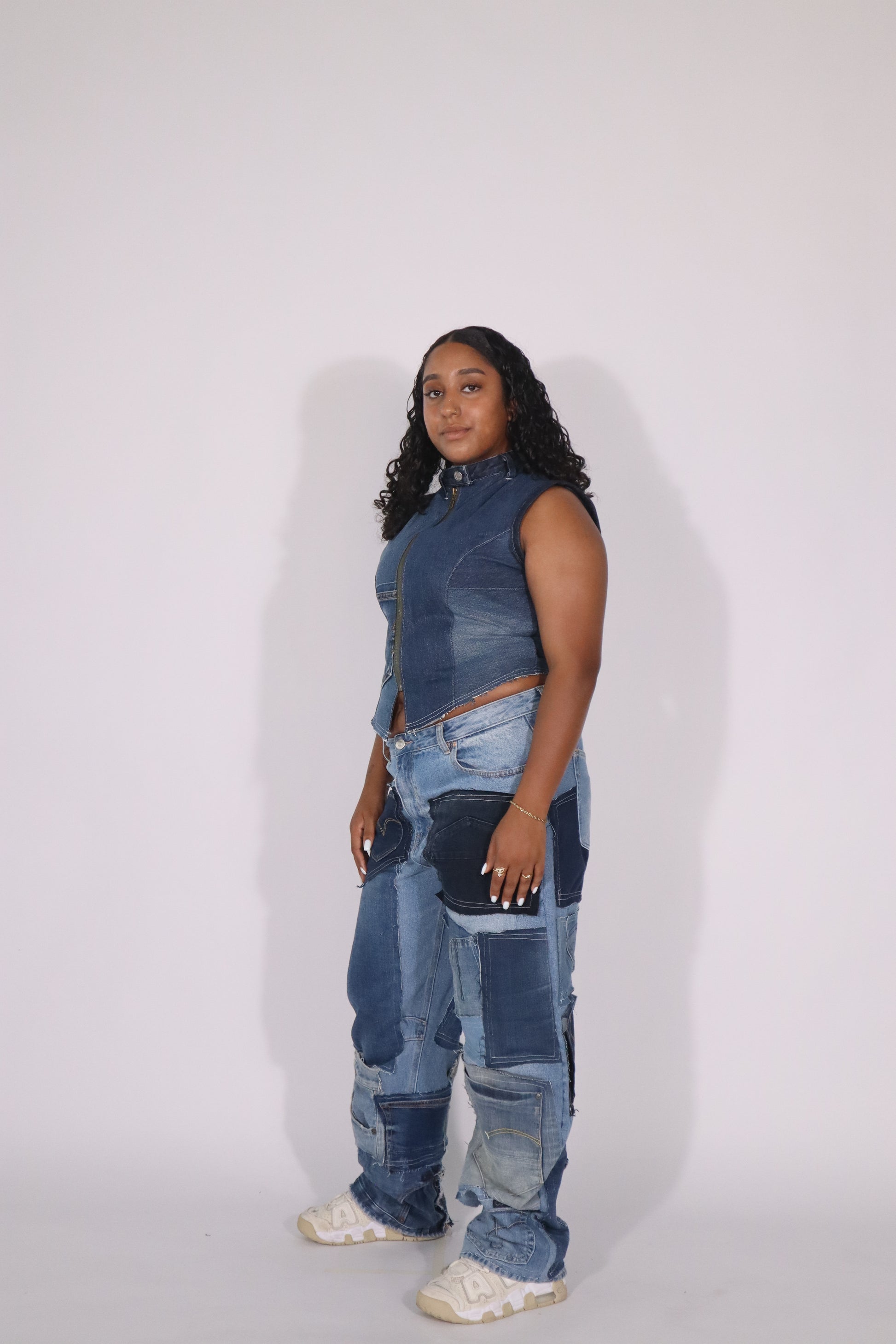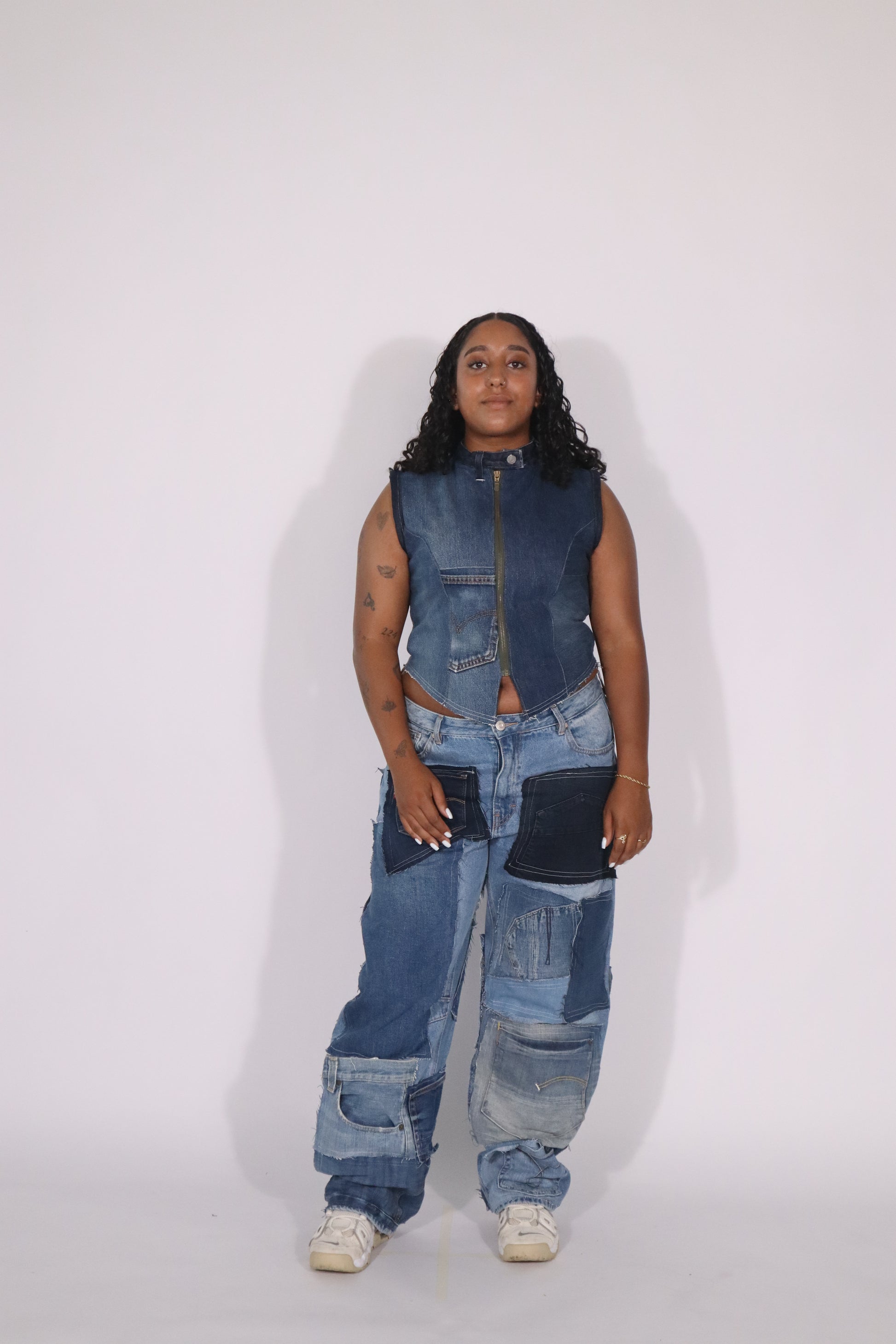 This fully denim race vest is handmade from upcycled materials, designed with a sleek silhouette and extra stretch for a comfortable fit. Featuring a sturdy front zipper and raw-cut armholes, this vest offers both edge and flexibility.